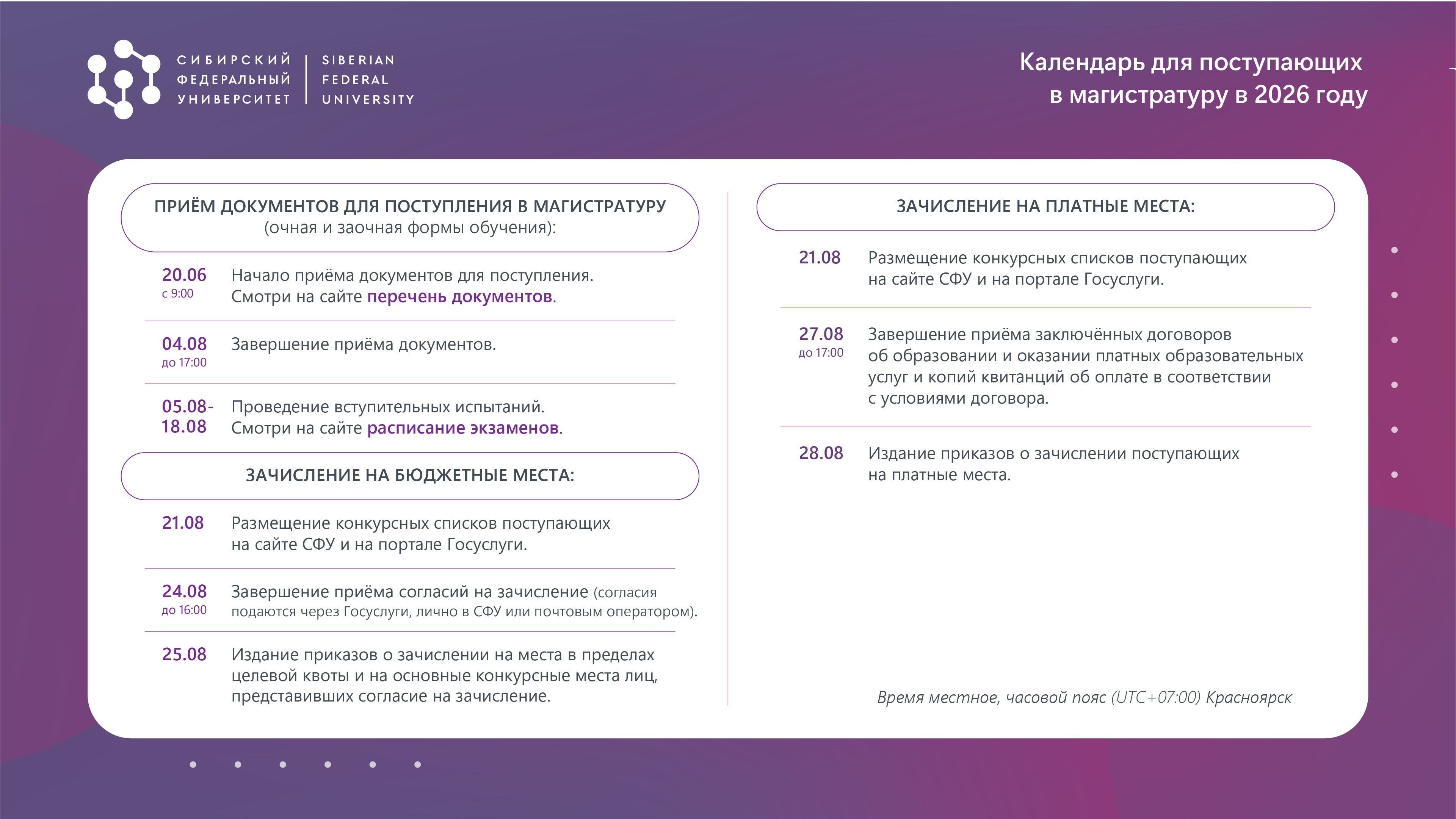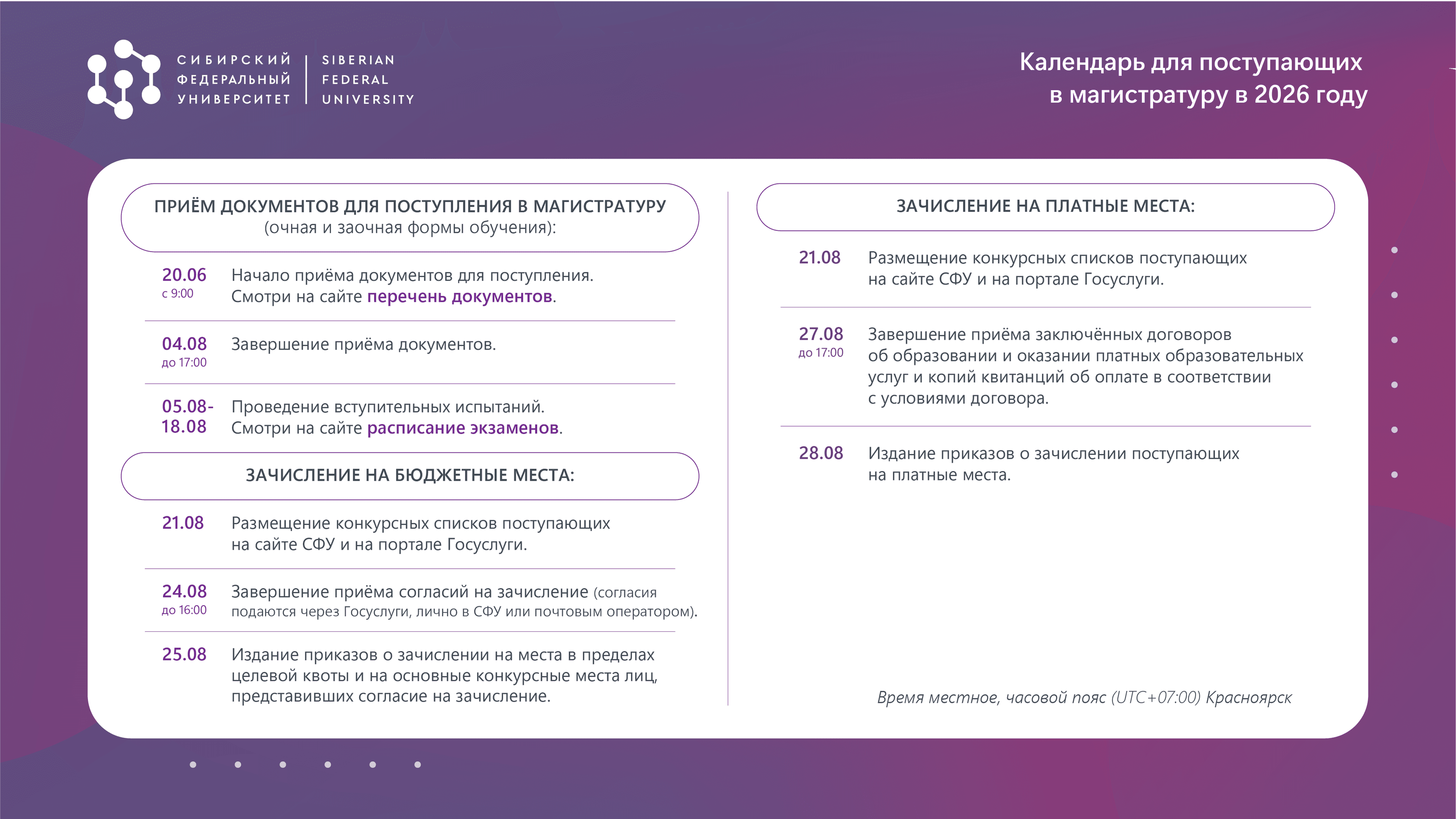 Приём документов — с 20 июня по 4 августа 2026 года до 13:00 по московскому времени (до 17:00 по красноярскому времени) (очная и заочная формы обучения).