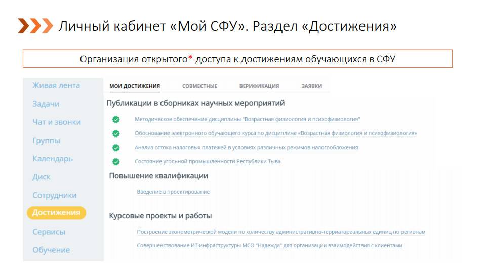 В профиль можно добавить фотографию, контакты, телефон, ссылки на социальные сети и сайты и др. Туда же можно загрузить свои достижения в учёбе, спорте, общественной деятельности, формируя электронное портфолио. Уже однажды загруженные сведения, прошедшие проверку специалистами университета, автоматически попадают, например, в заявление на повышенную стипендию. Это очень удобно и позволяет упростить подачу документов.