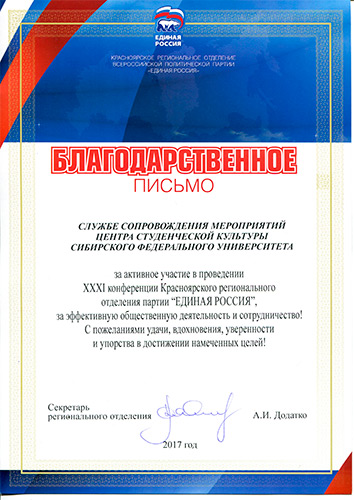за активное участие в проведении XXXI конференции Красноярского регионального отделения партии «Единая Россия», за эффективную общественную деятельность