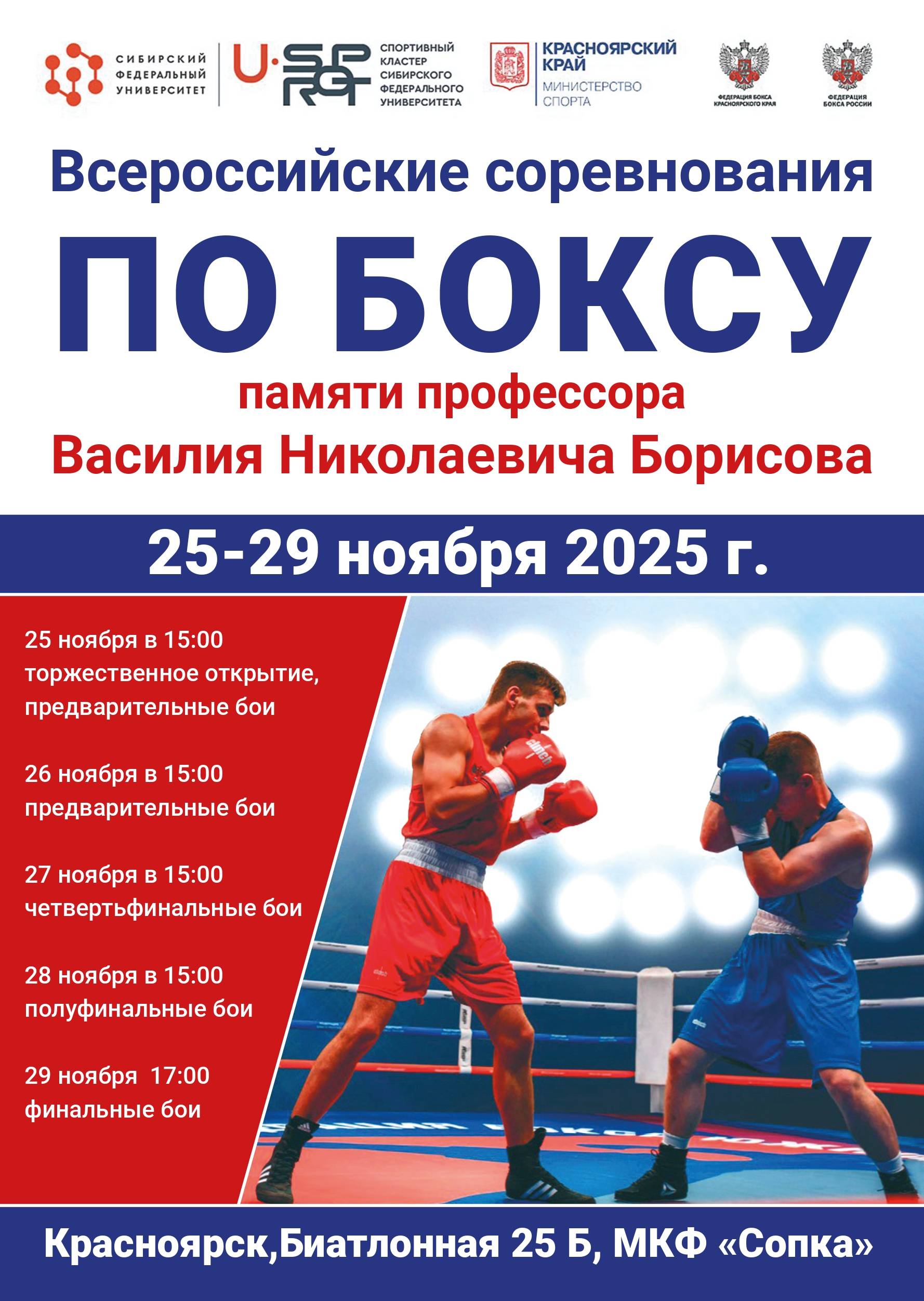 С 25 по 29 ноября 2025 года в Сибирском федеральном университете пройдут Всероссийские соревнования по боксу памяти первого ректора Красноярского политехнического института, профессора Василия Николаевича Борисова.