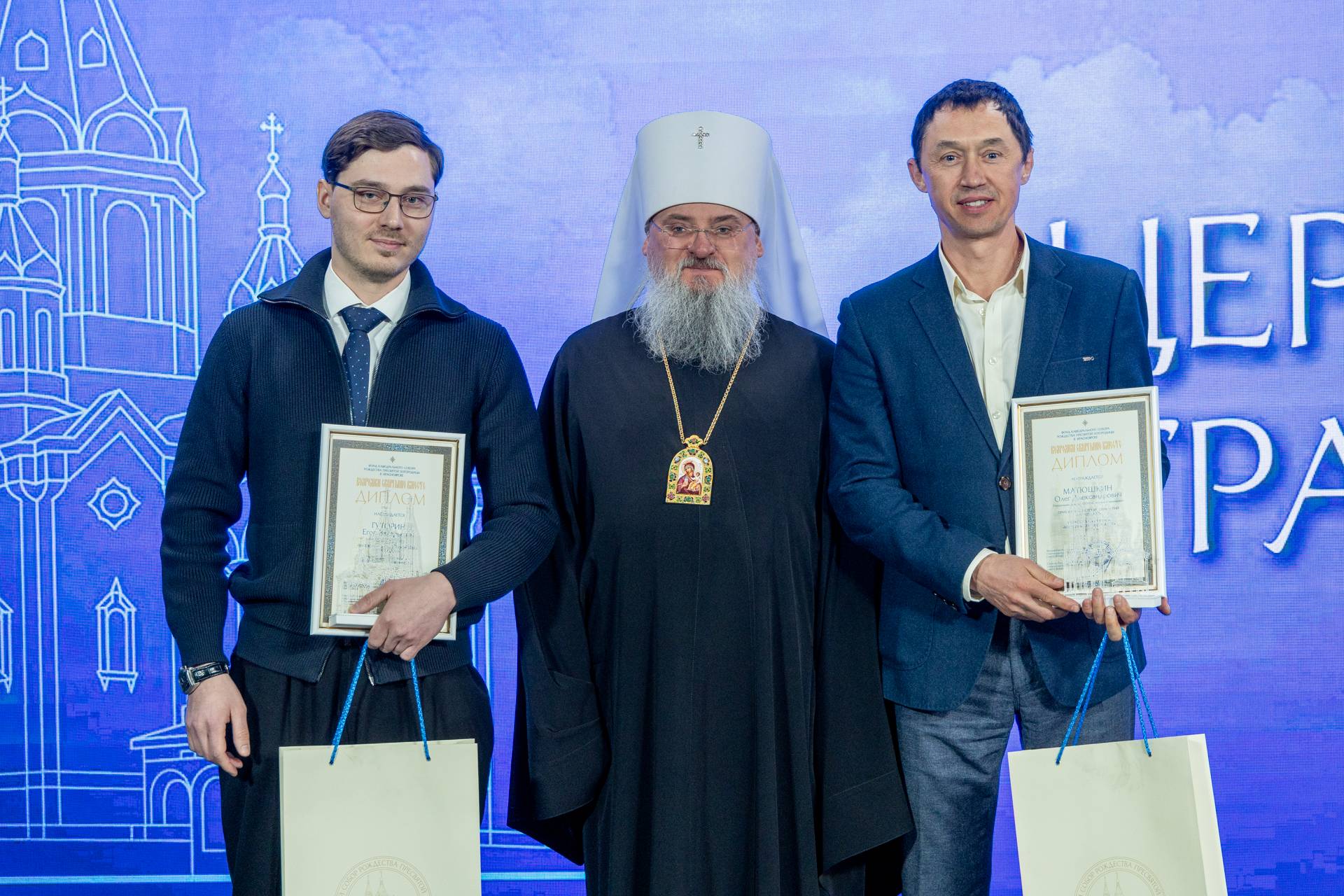 Ольга Чижевская, руководитель учебно-методического центра по противодействию терроризму Координационного центр по вопросам формирования у молодёжи активной гражданской позиции, предупреждения межнациональных и межконфессиональных конфликтов, противодействия идеологии терроризма и профилактики экстремизма и Татьяна Веселина, директор культурно-исторического центра «Успенский», структурного подразделения Центра народного творчества Красноярского края, вручили спецприз для воскресных школ Красноярска и края «Рождественский свет» воспитанникам Воскресной школы храма Святых мучениц Веры, Надежды, Любови и матери их Софии Красноярска.