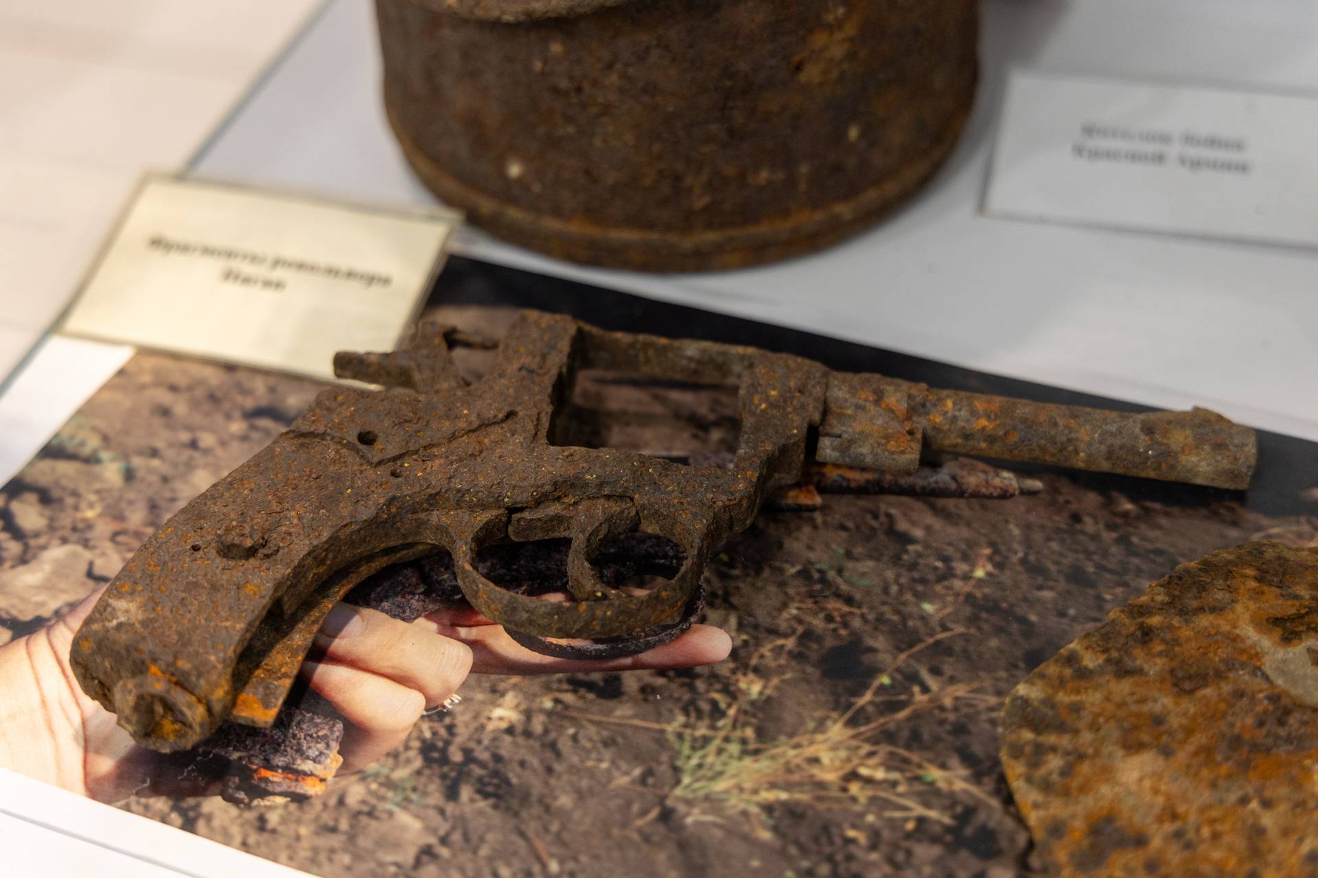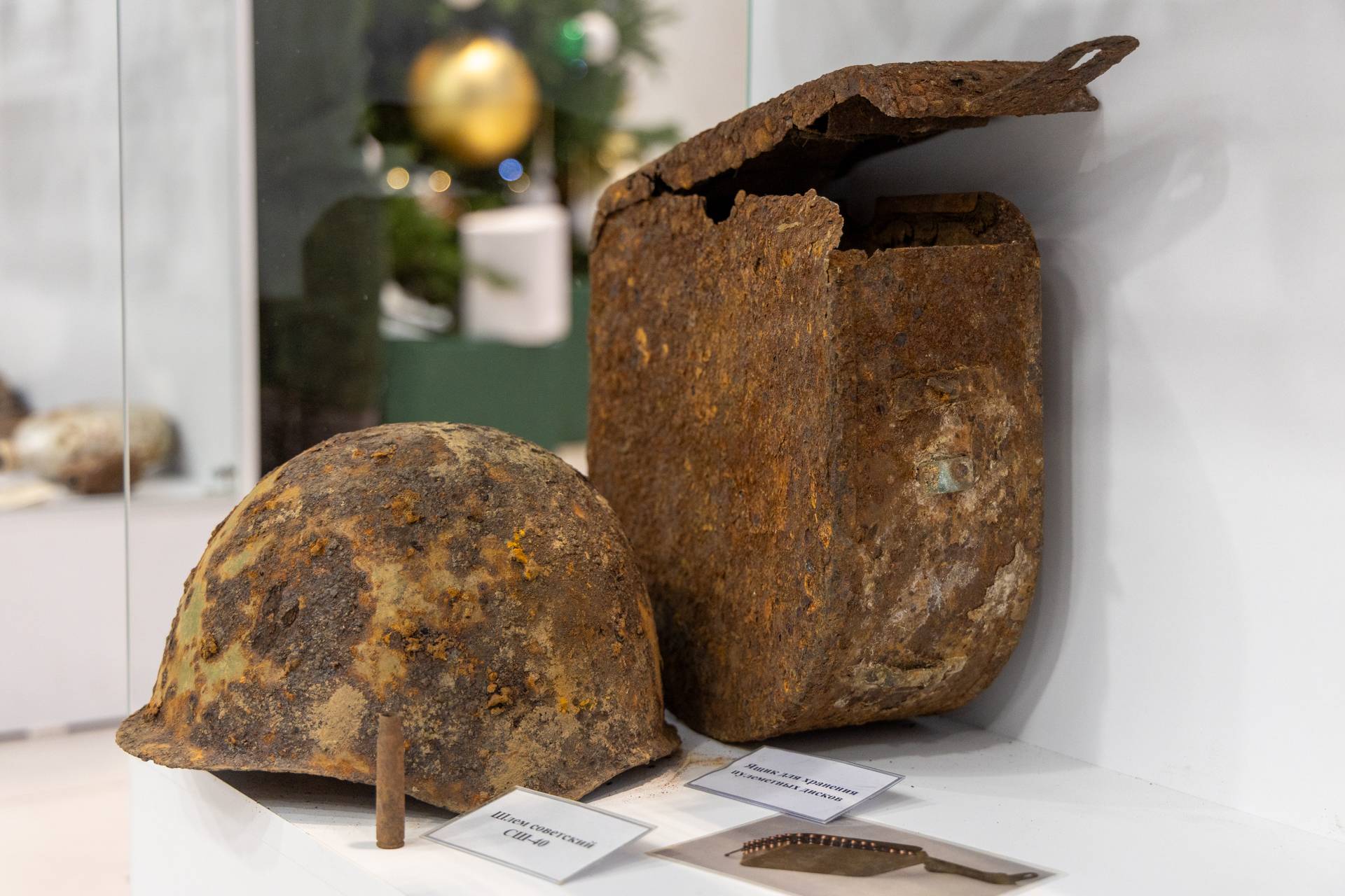 Среди экспонатов выставки — советская сапёрная лопатка, красноармейская книжка 1942 года, советский противогаз, шлем СШ-40, фрагмент немецкой колючей проволоки и многое другое.