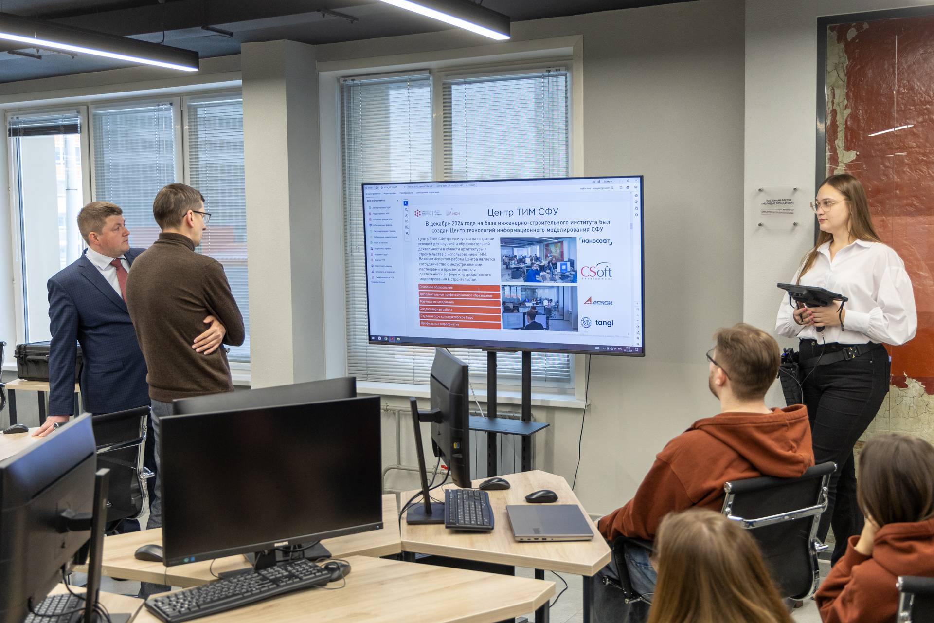 Визит стартовал с Центра ТИМ в Инженерно-строительном институте СФУ, студенты и эксперты которого в этом году стали лидерами конкурса «ТИМ-ЛИДЕРЫ 2024/2025» — лучшими в стране в компетенции инженерное проектирование в конкурсе AtomSkills – 2025.