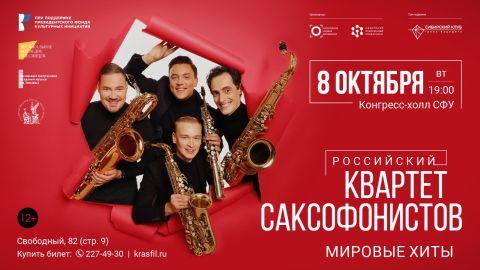 8 октября в Конгресс-холле Сибирского федерального университета Российский квартет саксофонистов представит программу «Мировые хиты». Выступление откроет цикл концертов Красноярской филармонии в Сибирском федеральном университете в новом учебном году.