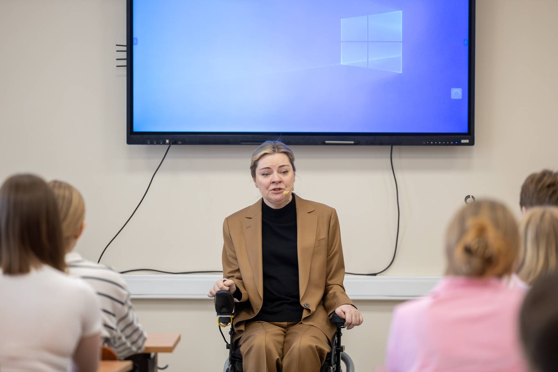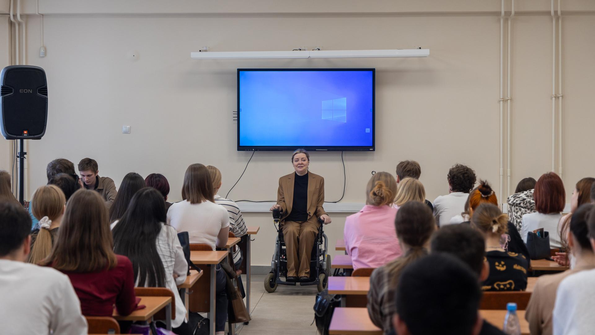 На встрече со студентами СФУ, прошедшей в ИНиГ 27 апреля, Наталья Каптелинина рассказала об особенностях своей работы, отношении к людям с ОВЗ в России, личном преодолении тяжёлой травмы после ДТП, когда ей пришлось заново учиться жить не только физически, но и морально, восстановлении и вере в будущее, энергии и любви к жизни, которую даёт осознание момента, когда ты находишься на краю смерти.