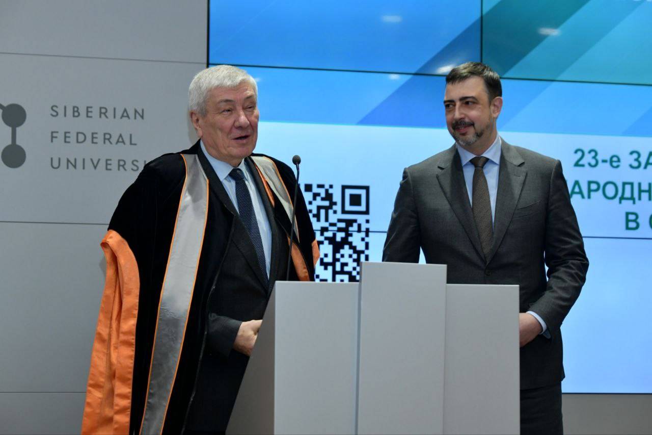 Во время заседания и. о. ректора СФУ Максим Румянцев объявил о присвоении директору Федеральной службы по финансовому мониторингу, Председателю Совета МСИ Юрию Чиханчину звания Почётного профессора Сибирского федерального университета.