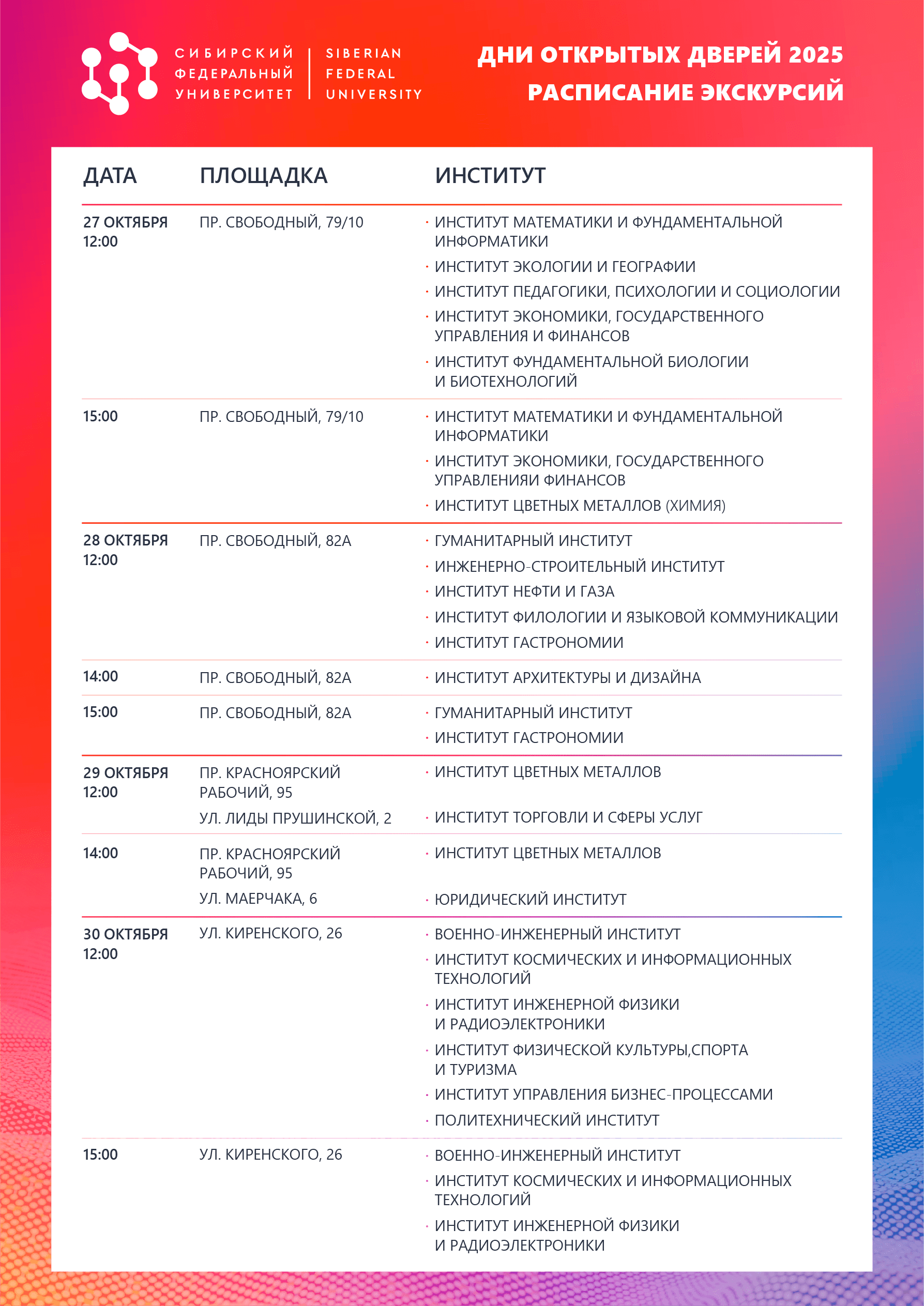 Внимательно изучайте календарь событий, места проведения и с 27 октября по 1 ноября встречаемся в Сибирском федеральном университете на Днях открытых дверей.