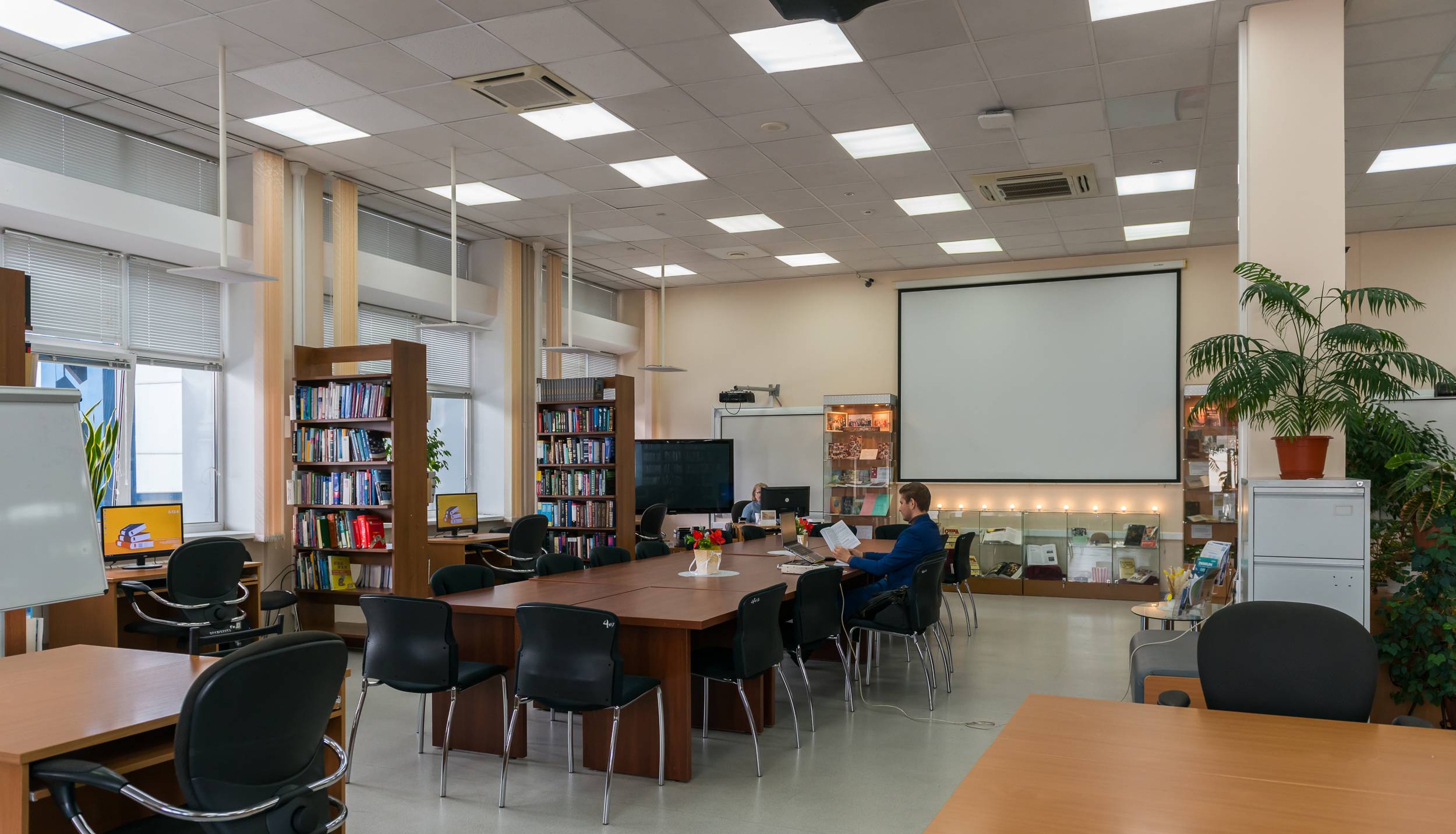 Оборудование: проектор с экраном, кафедра для докладчиков, 6 столов, амфитеатр.