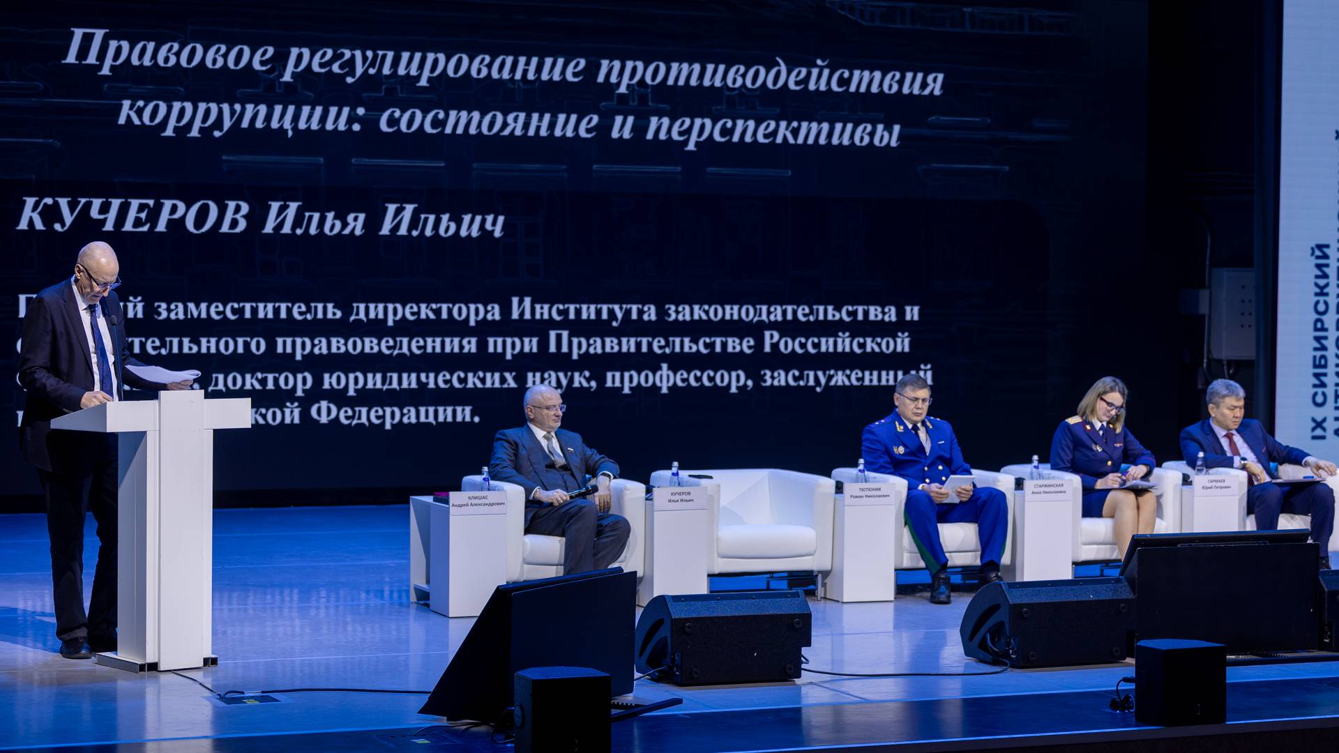 Перед началом пленарного заседания перед гостями форума выступил Сергей Пономаренко, первый заместитель Губернатора Красноярского края, руководитель Администрации Губернатора Красноярского края: «За десять лет проведения форум завоевал статус экспертной площадки всероссийского уровня по теме противодействия коррупции, стал одним из самых мощных интеллектуальных событий по данной теме. Это подтверждают и уровень дискуссий, и эксперты, которые к нам приезжают. Высокий интерес к форуму мы видим и у научного сообщества, и у представителей органов власти, и у сотрудников правоохранительной системы. Мы очень благодарны организаторам форума, которые принимают самое активное участие в его подготовке и формируют актуальную для сегодняшнего дня программу».