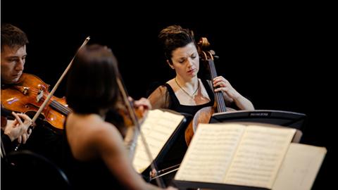На сцене Конгресс-холла прозвучали струнные квартеты Клода Дебюсси и Мориса Равеля в исполнении солистов легендарного оркестра Теодора Курентзиса — Ольги Волковой (первая скрипка), Ивана Субботкина (вторая скрипка), Наила Бакиева (альт), Мириам Пранди (виолончель).