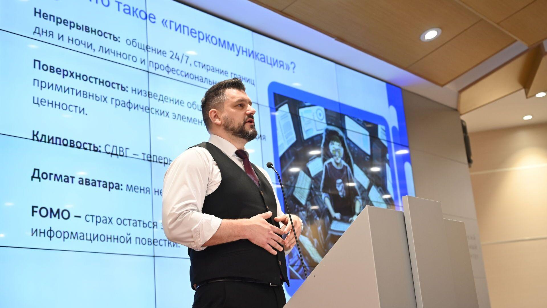 Он охарактеризовал гиперкоммуникацию через ключевые признаки: непрерывность общения 24/7, рост числа контактов в ущерб их качеству, ношение «аватара» (маски) в сети и страх выпасть из информационного потока (FOMO).