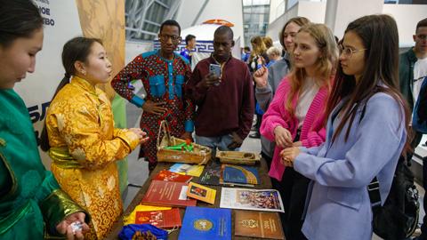 Участники встречали гостей в национальных костюмах и приветствовали на родных языках. Также на первом этаже Конгресс-холла была представлена фотовыставка «Студенты СФУ — Студенты Мира».