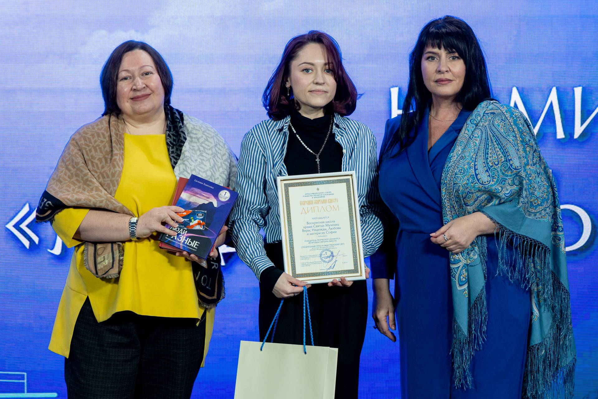 Ольга Чижевская, руководитель учебно-методического центра по противодействию терроризму Координационного центр по вопросам формирования у молодёжи активной гражданской позиции, предупреждения межнациональных и межконфессиональных конфликтов, противодействия идеологии терроризма и профилактики экстремизма и Татьяна Веселина, директор культурно-исторического центра «Успенский», структурного подразделения Центра народного творчества Красноярского края, вручили спецприз для воскресных школ Красноярска и края «Рождественский свет» воспитанникам Воскресной школы храма Святых мучениц Веры, Надежды, Любови и матери их Софии Красноярска.