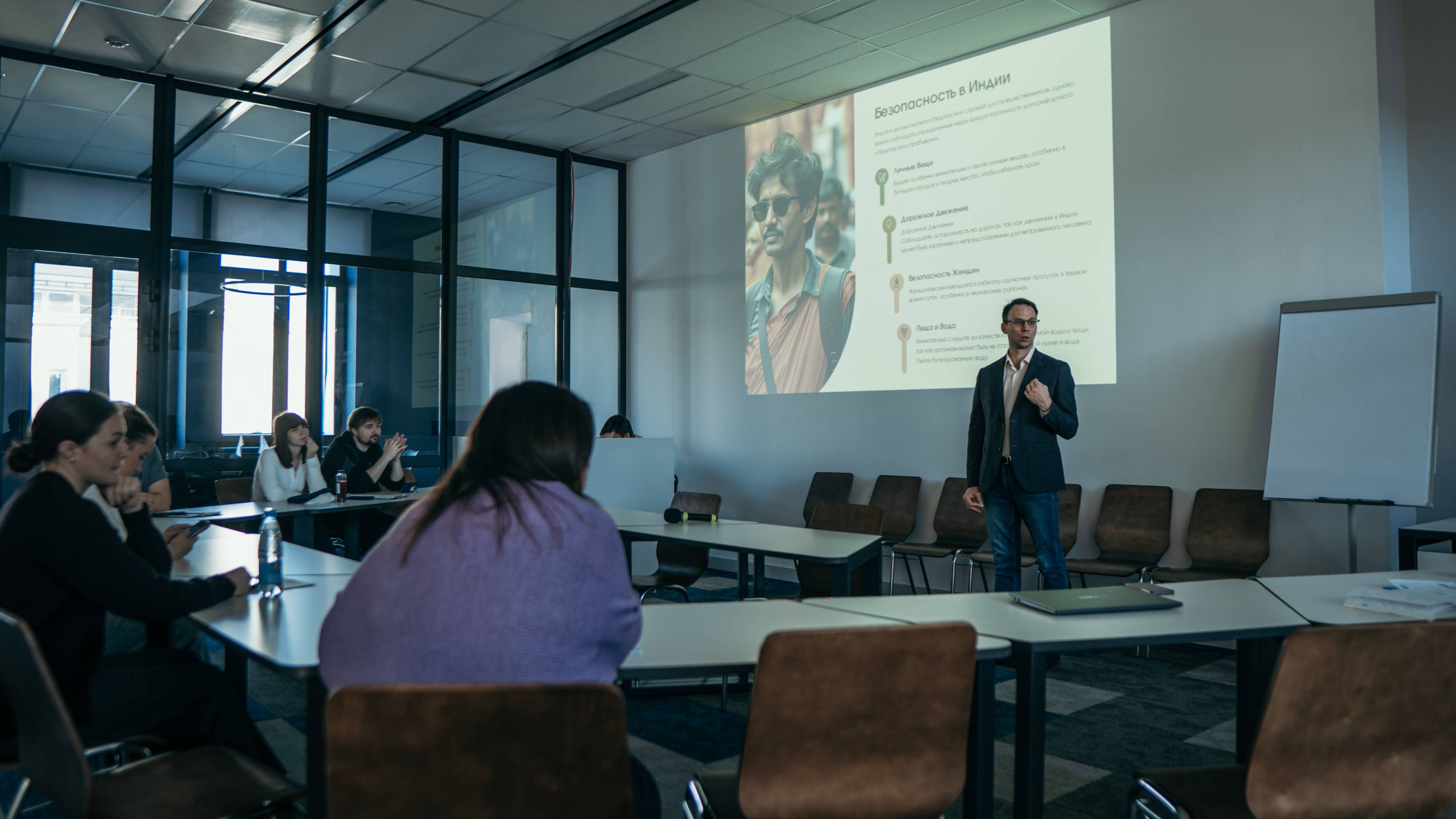 Эксперты общества «Знание» провели для студентов лекцию об эффективной коммуникации в команде. Вопросы можно было задать на встрече с Сосланом Тдаевым, начальником отдела по делам национальностей, религий и казачества управления общественных связей Губернатора края.