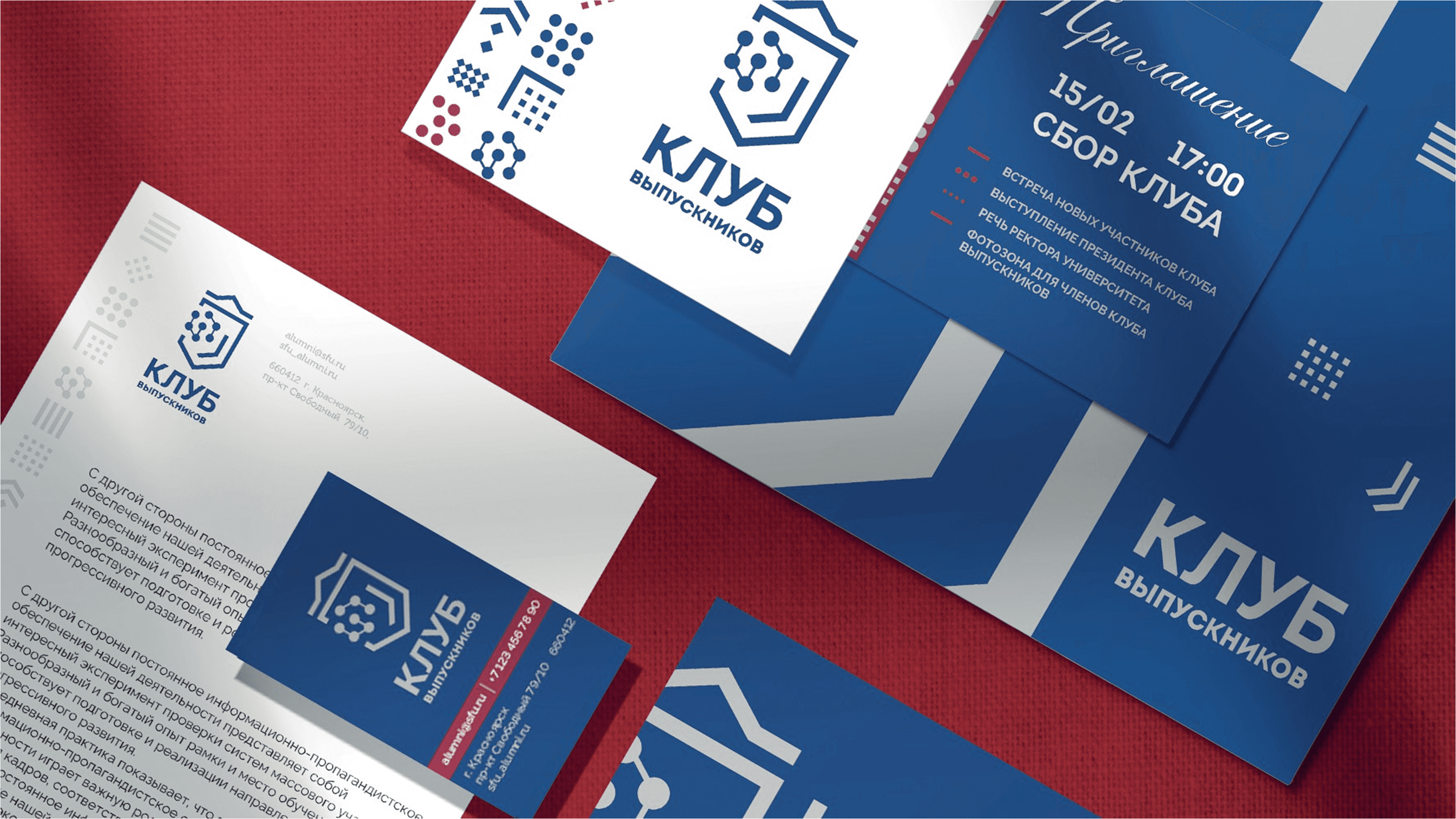 Разработка фирменного стиля Клуба выпускников СФУ велась в рамках дипломного проекта выпускницы Института архитектуры и дизайна Анны Шевелюхиной по заказу Сибирского федерального университета. После защиты диплома выпускница продолжила работу над проектом и разработала итоговый вариант фирменного стиля.