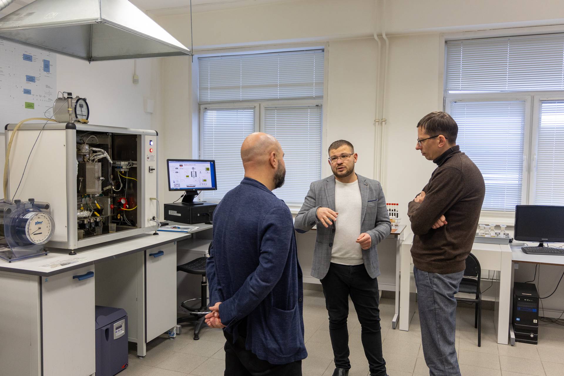 В Институте нефти и газа СФУ врио директора Константин Дворкин и старший преподаватель базовой кафедры химии и технологии природных энергоносителей и углеродных материалов СФУ Роман Ваганов представил научно-исследовательские разработки в области новых материалов и переработки углеводородного сырья Лаборатории катализа и нефтехимии и НИР в области нефтепромысловых реагентов, реагентов для повышения нефтеотдачи Лаборатории нефтепромысловой химии ИНиГ.