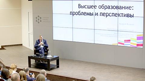 12 апреля 2021 года в СФУ директор Института общественных стратегий Московской школы управления СКОЛКОВО, заместитель председателя Совета по повышению конкурентоспособности ведущих университетов России среди ведущих мировых научно–образовательных центров Андрей Волков выступил с открытой лекцией «Высшее образование: проблемы и перспективы».